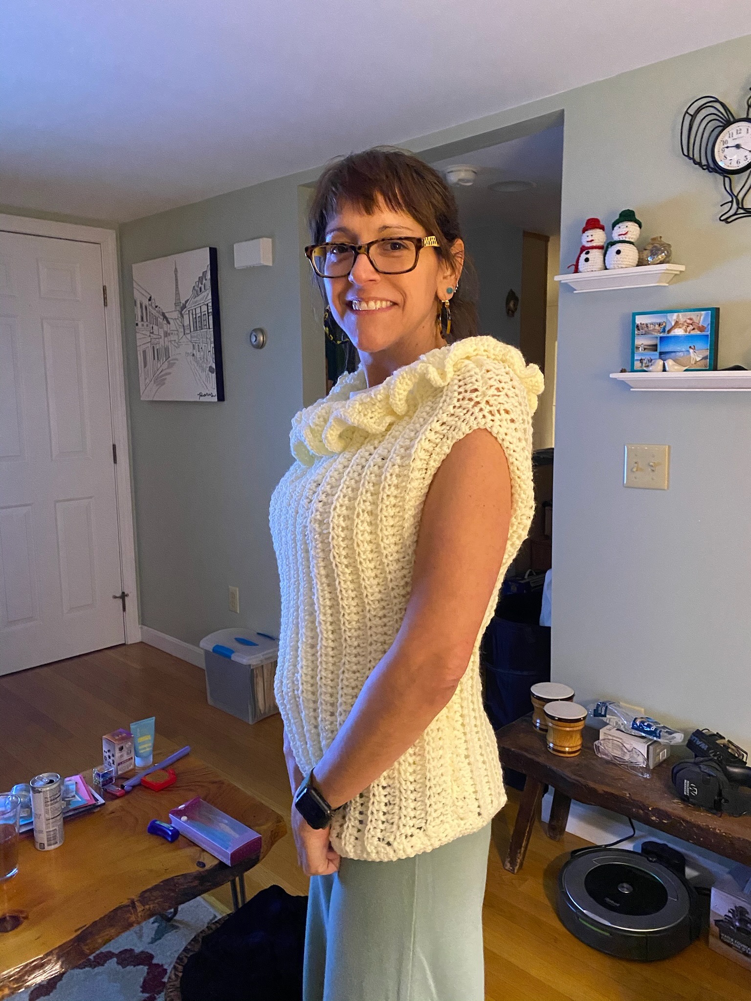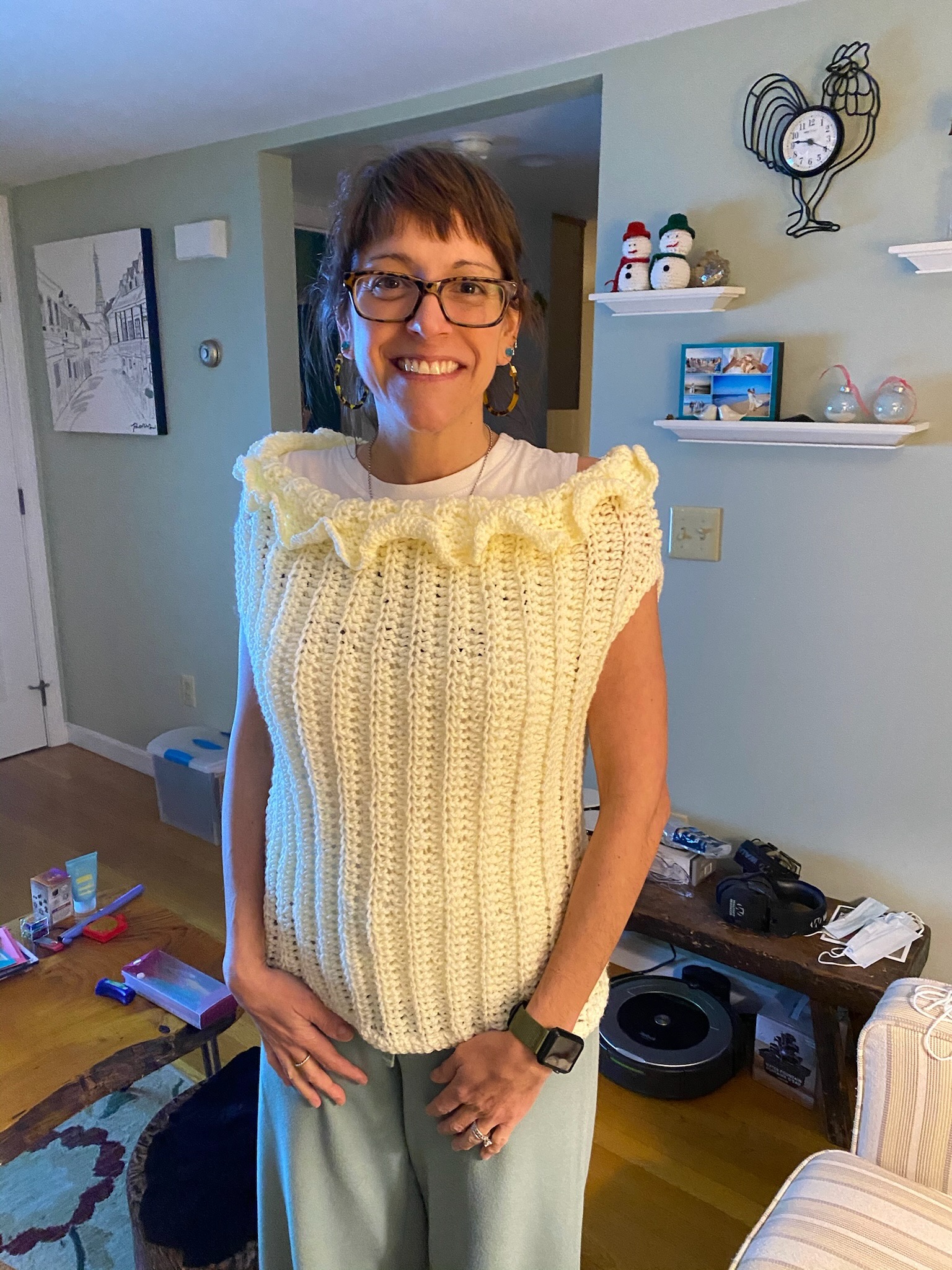 Pretty as a buttercup! This sleeveless top is crocheted in soft butter yellow with a darling ruffle neckline. Ribbed body for a flattering fit. One size fits most. Perfect for spring days, summer picnics, or anytime you need a little sunshine!