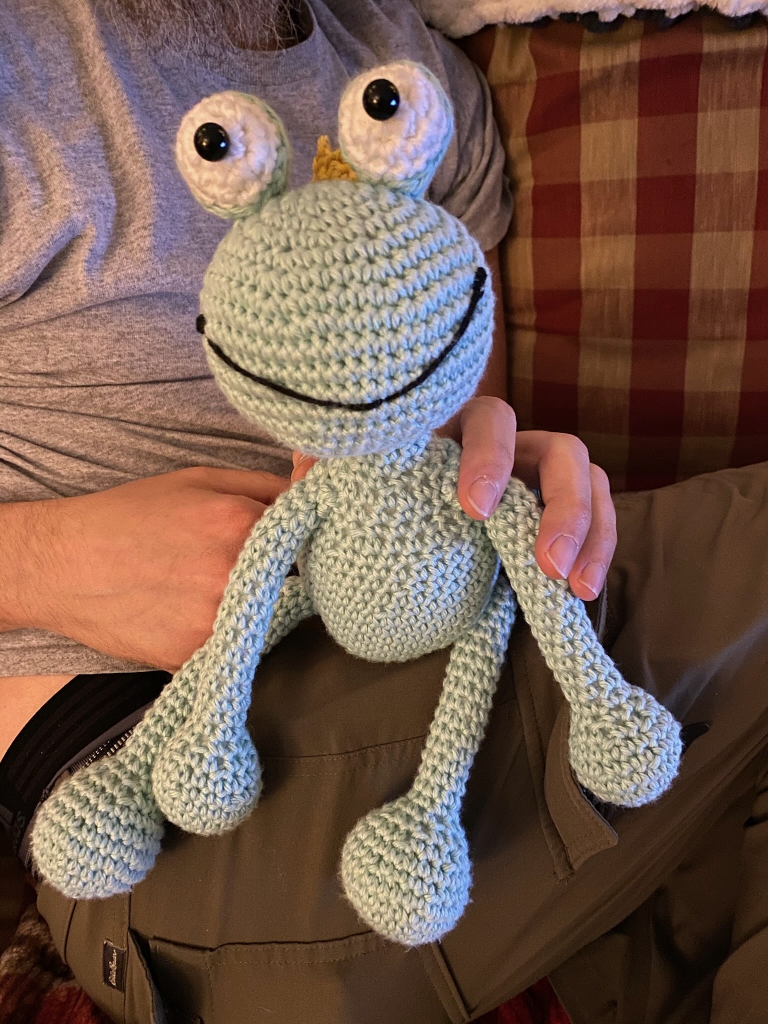 This charming fellow is ready to be your prince! Ferdinand is crocheted in soft sage green with a tiny golden crown and the sweetest smile. He's about 12 inches tall and stuffed with polyester fiberfill. Perfect for cuddling or as nursery decor!