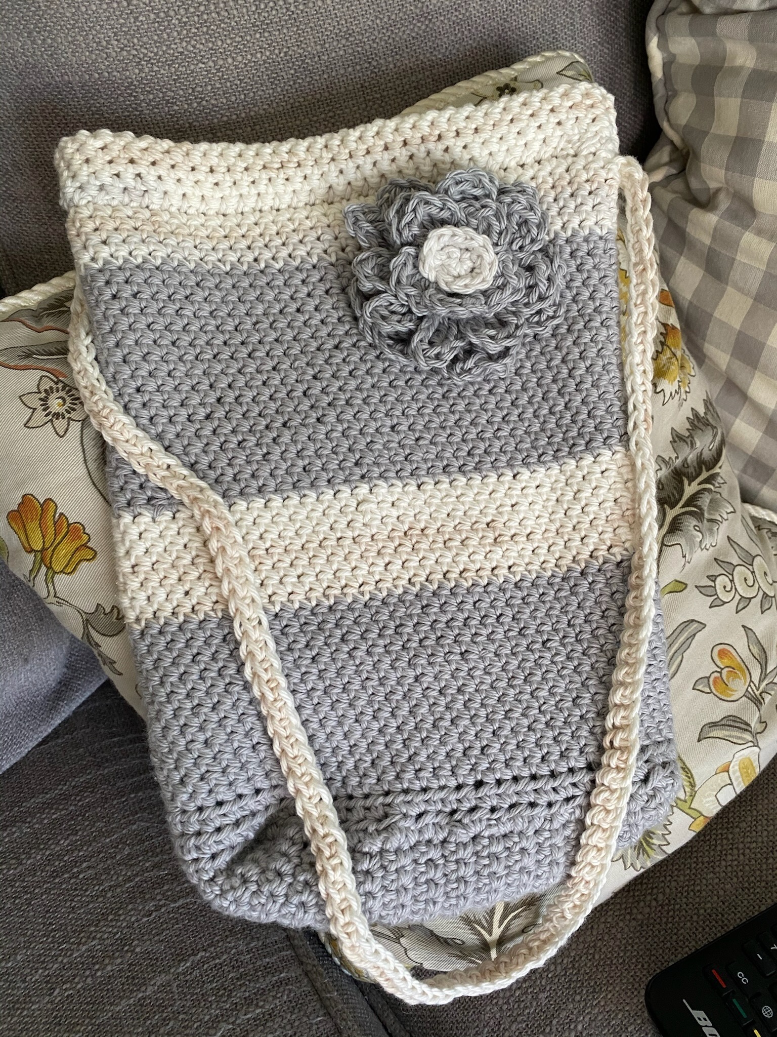 Carry your essentials in style! This crossbody bag is crocheted in gray and cream with a lovely 3D flower accent. Has a long strap and a roomy interior. Perfect size for phone, wallet, and keys!