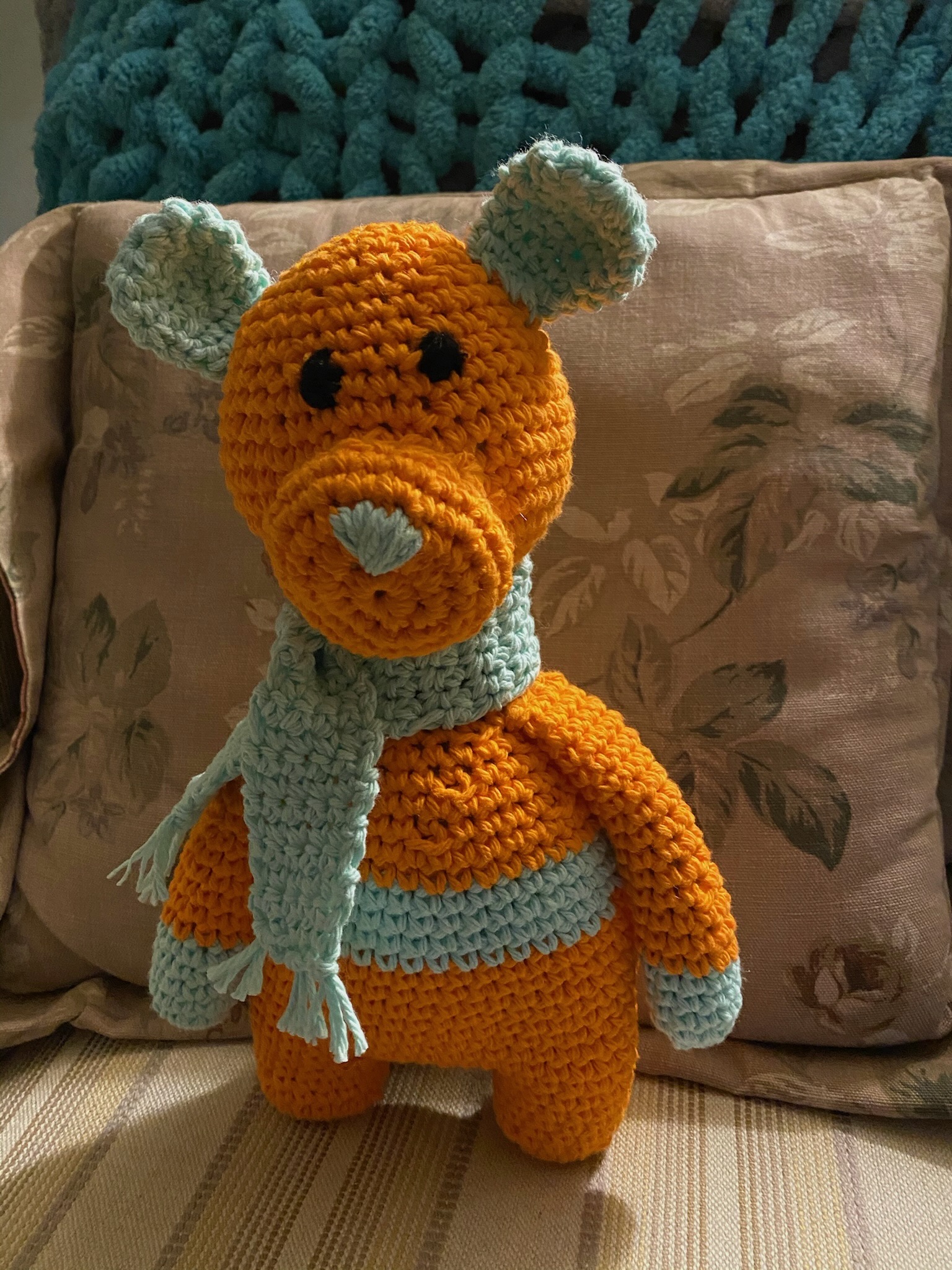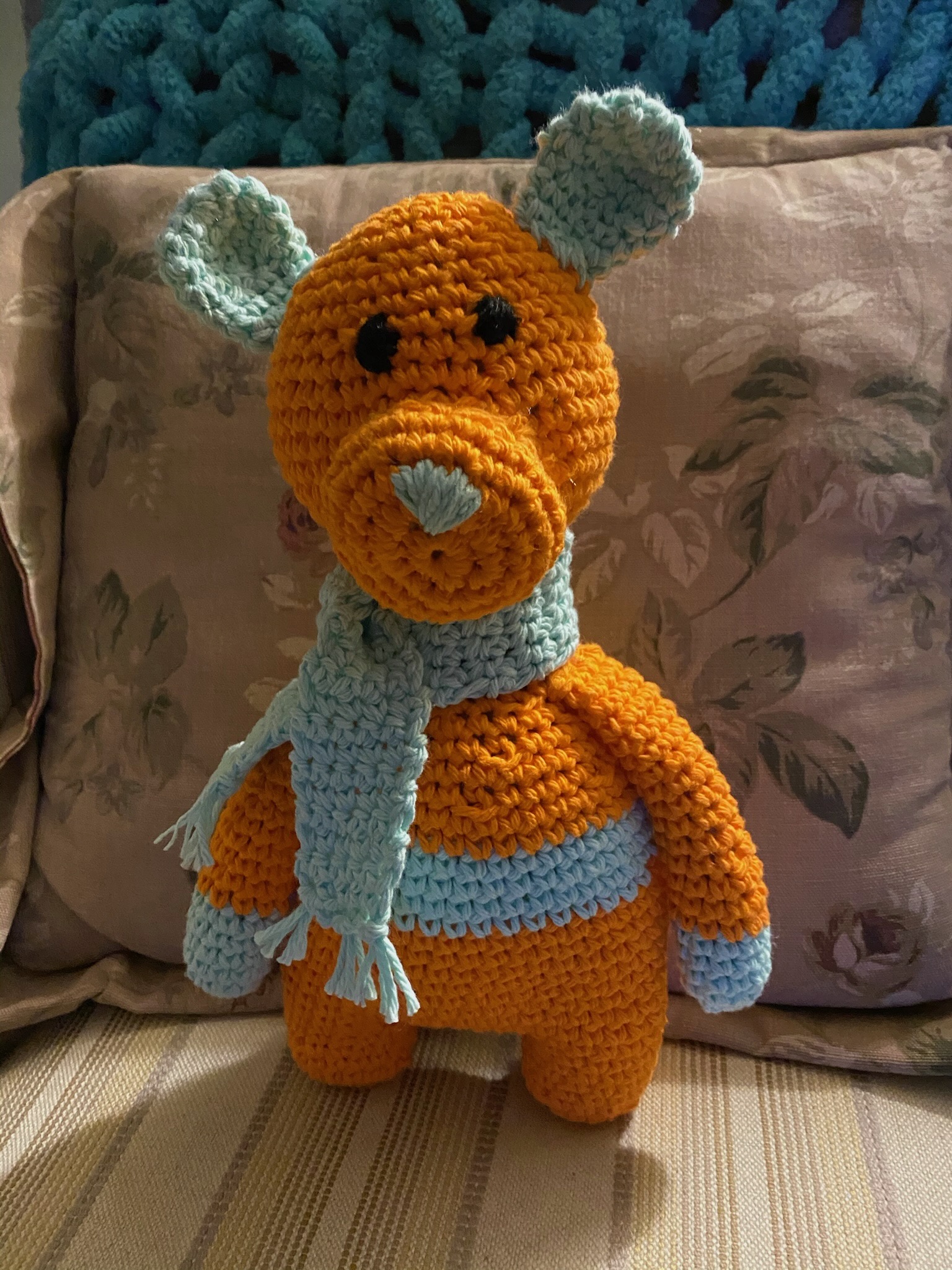 Say hello to Gerald! This tall drink of water is crocheted in warm orange with a cozy blue scarf. Standing about 14 inches tall, he's got the longest neck for the biggest hugs. Super soft and extra loveable!