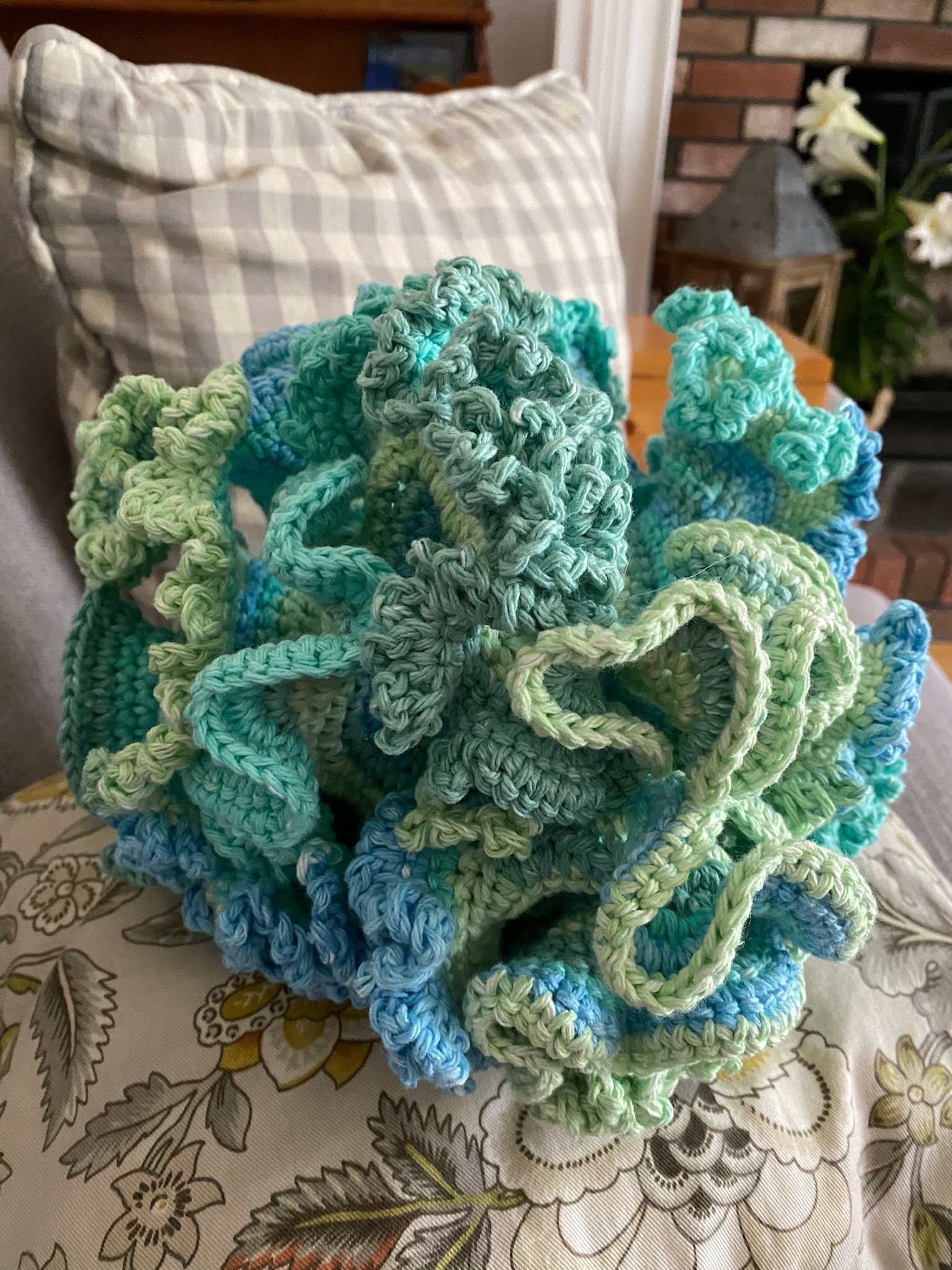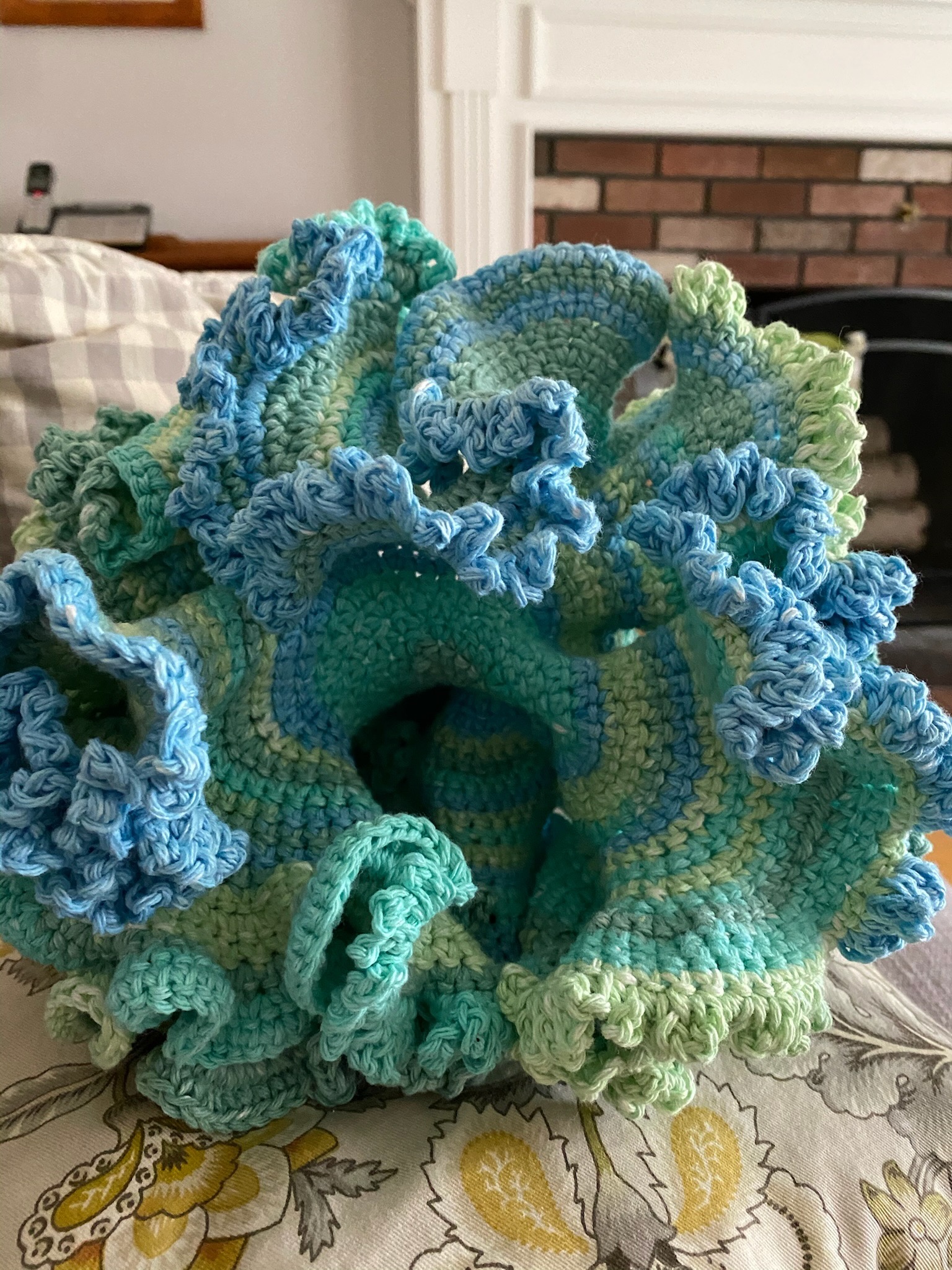 Bring the reef home! This hyperbolic crochet sculpture mimics the beautiful ruffles of ocean coral. Made in swirling teals, blues, and greens. About 8 inches across — a stunning conversation piece!