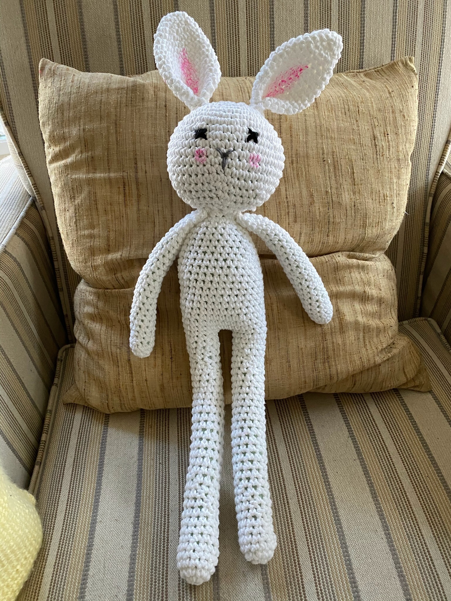 Snowball is extra leggy and extra loveable! This elegant white bunny has the longest floppy legs, pink inner ears, and a sweet embroidered face. About 18 inches from ear to toe — perfect for snuggling!