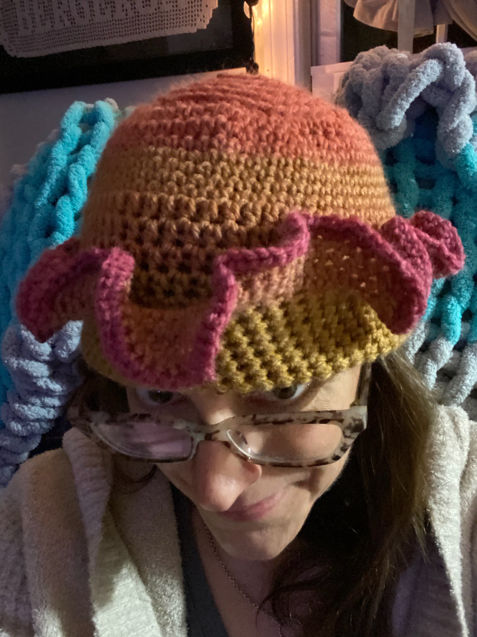 Turn heads in this show-stopping hat! Crocheted in gorgeous sunset tones of orange, pink, and gold with a fun ruffled brim. One size fits most adults. Perfect for festivals, beach days, or just feeling fancy!