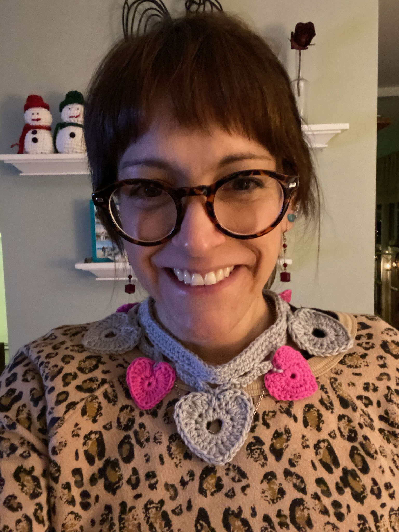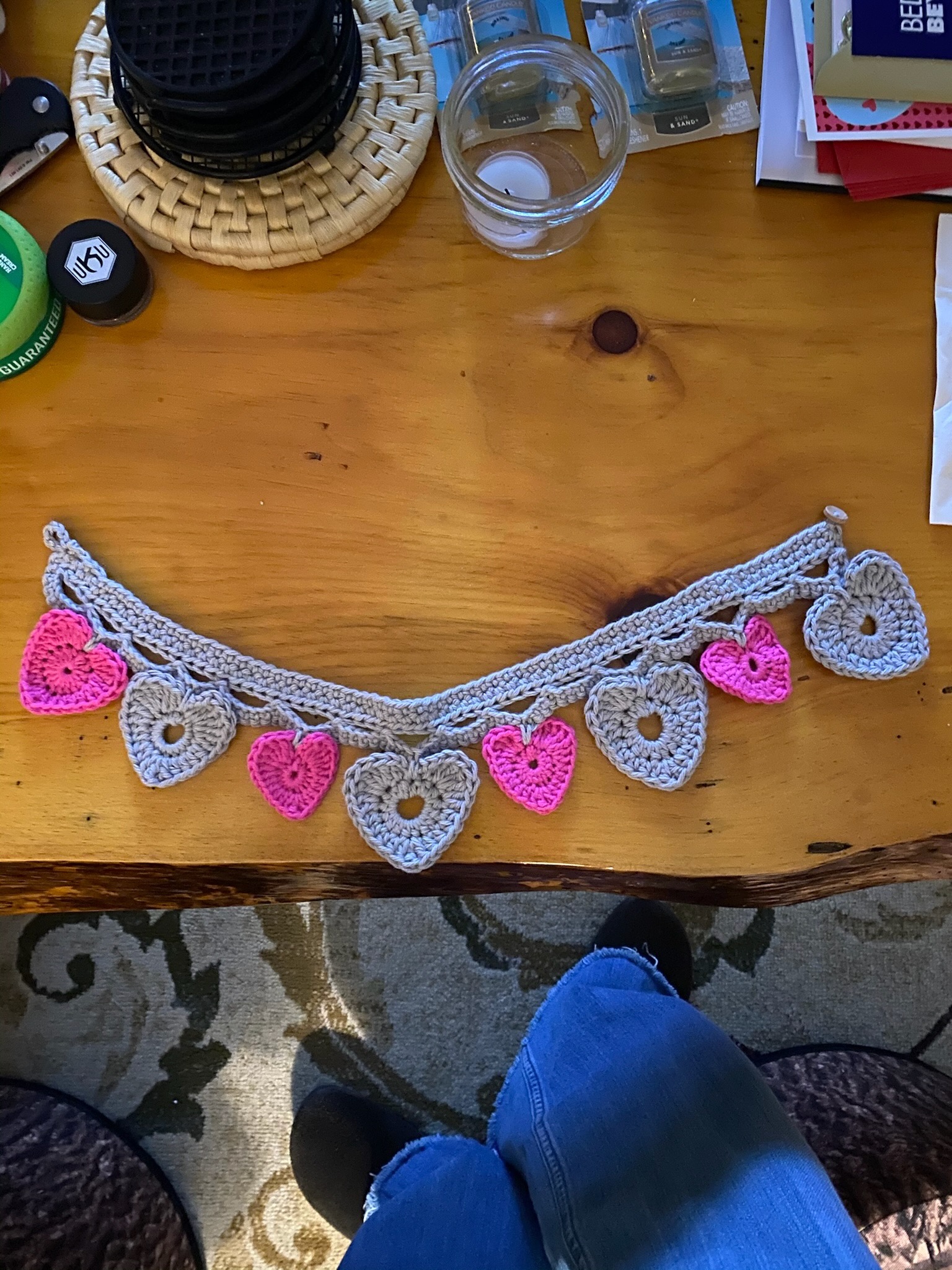A necklace that's all heart! This statement piece features gray and hot pink crochet hearts on a delicate collar. Ties in the back for adjustable fit. Perfect for Valentine's Day, date night, or whenever your outfit needs more love!